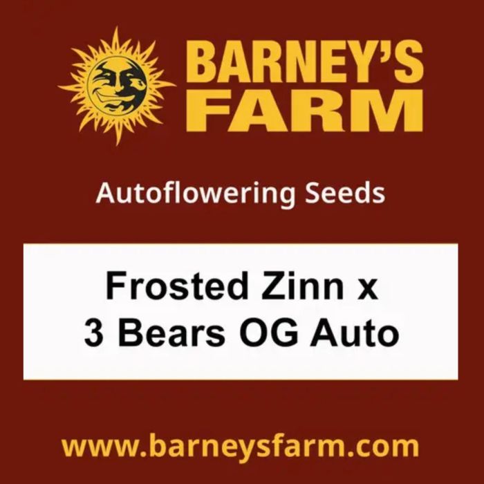 Frosted Zinn x 3 Bears OG Auto from Barneys Farm blends fruity aroma, heavy resin, and fast flowering for a powerful autoflower experience.